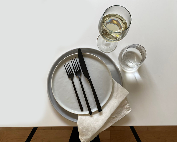 Uncategorized Black Flatware Table Setting / Blue carousel glassware with monkey pod chargers. Flatware is laid on the table in the order of use.